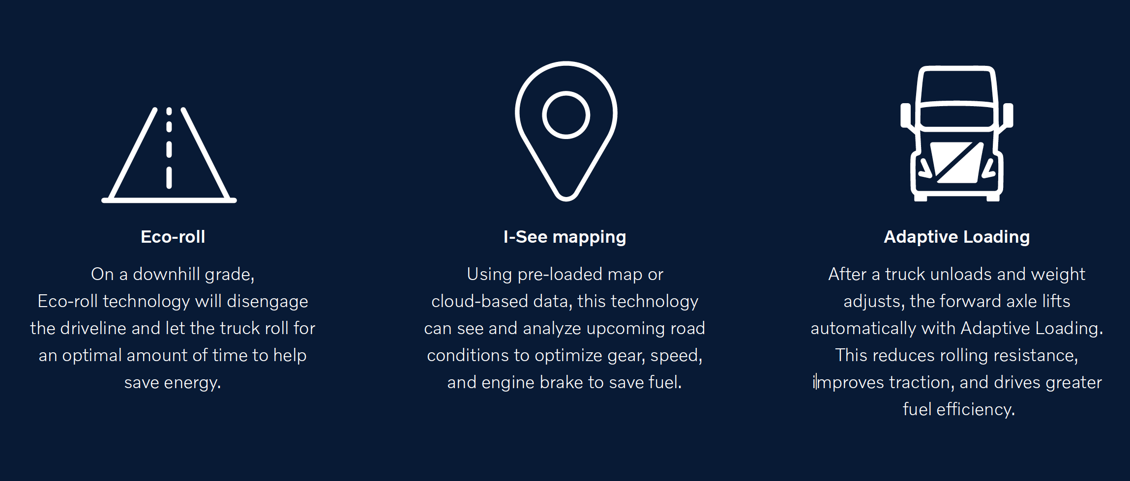 Low ground effects, front wheel closeouts, and a reduced height front fender work together to lessen drag and increase fuel efficiency. New cab side fairing extensions along with side air deflectors and fixed roof extensions are yet another ingenious way to smoothly guide airflow from cab to trailer and improve overall aerodynamic performance.