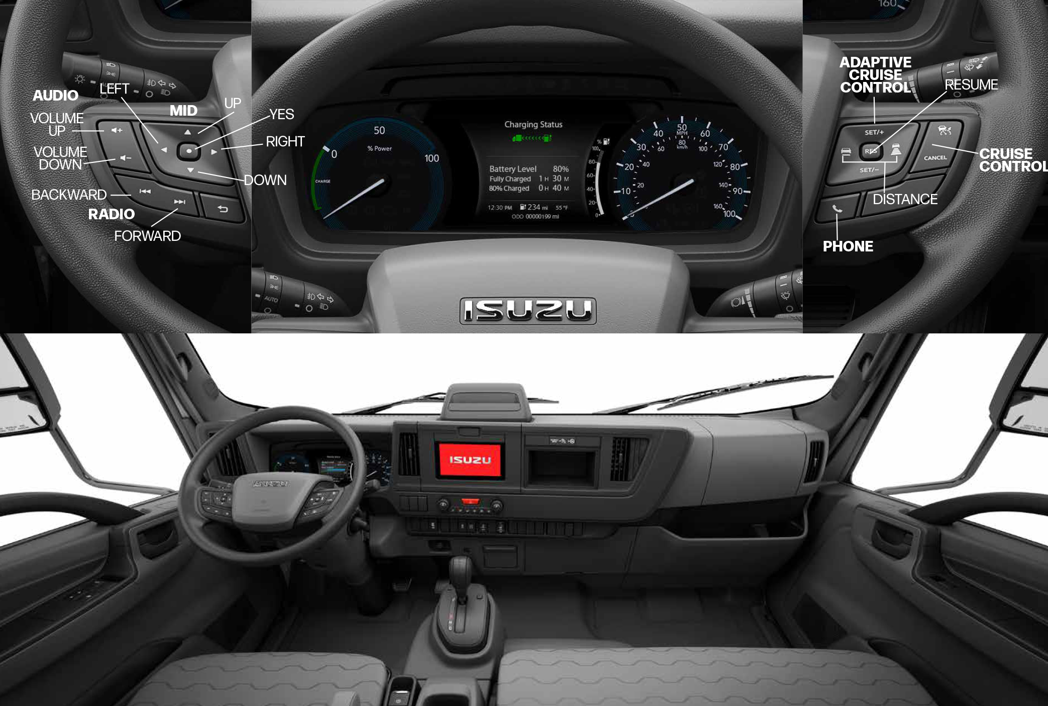 Start with the steering wheel. The steering wheel’s position and angle have been changed from prior Isuzu cabs to provide a better fit for a wider variety of drivers. Its smaller diameter means easier handling. And the steering wheel hub is home to switches that operate the Multi-Information Display, audio system, cruise control, hands-free phone calling and more.